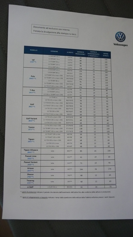Come anticipato nella sezione Polo GTI sono riuscito a fotografare i tempi ufficiali di consegna dei vari modelli. Qualsiasi data vi diano diverse da queste sono inventate. Naturalmente, nel tempo, possono cambiare.